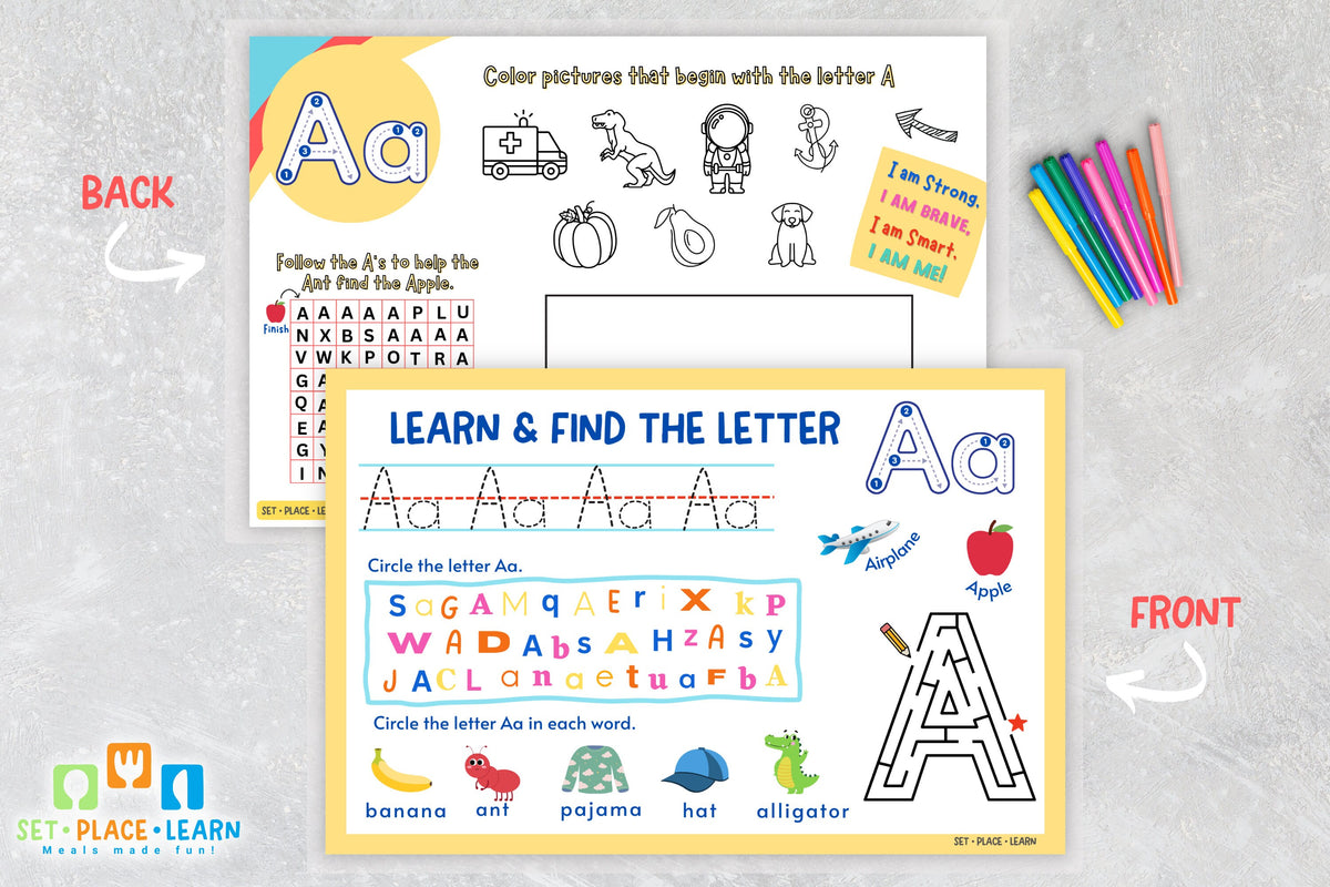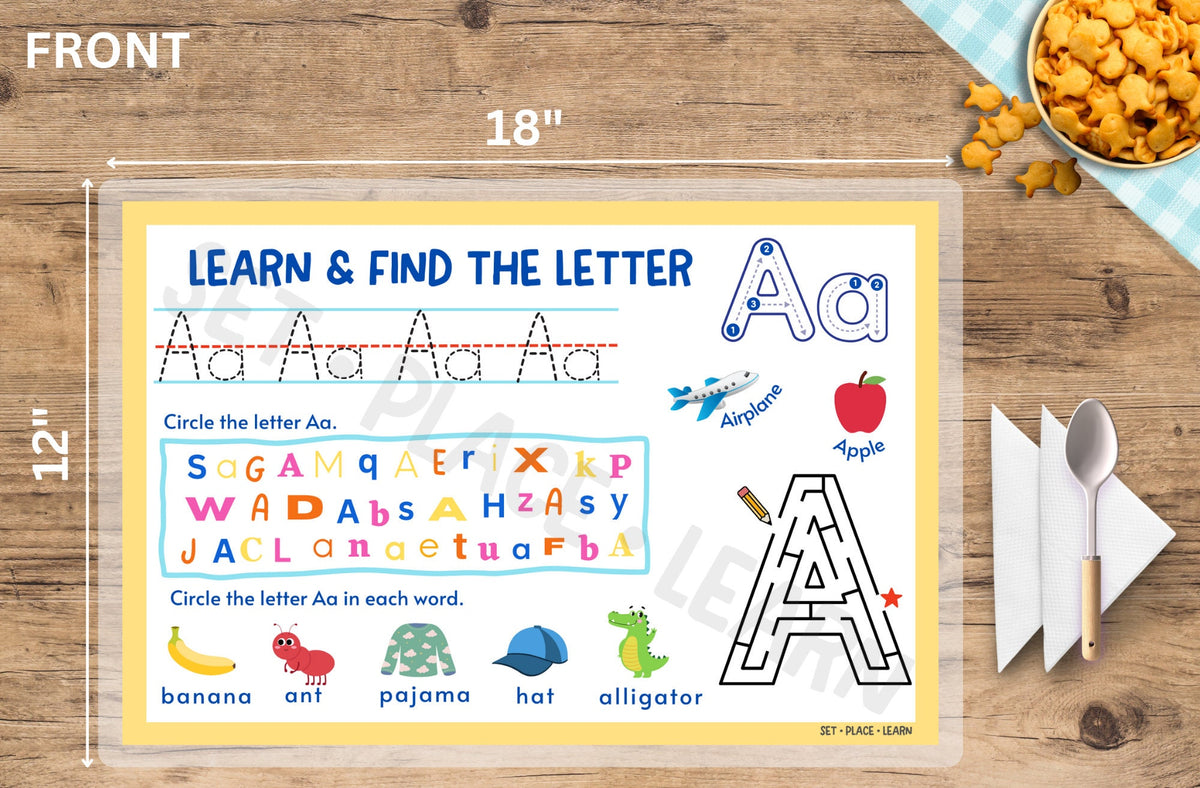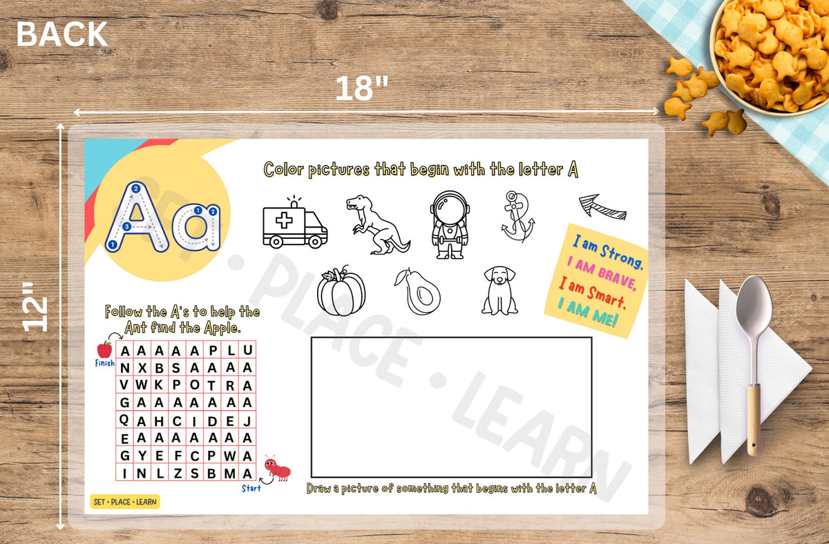 At Set Place Learn, we're passionate about creating joyful learning experiences. Our Alphabet Series is a fantastic resource for children who are just beginning to explore the alphabet. With each placemat, we introduce just one letter at a time, providing a less overwhelming and more focused approach. Each mat includes interactive activities to reinforce each letter including mazes, search and find games, identify by coloring etc. Stay tuned as we continue to expand this series from A to Z!