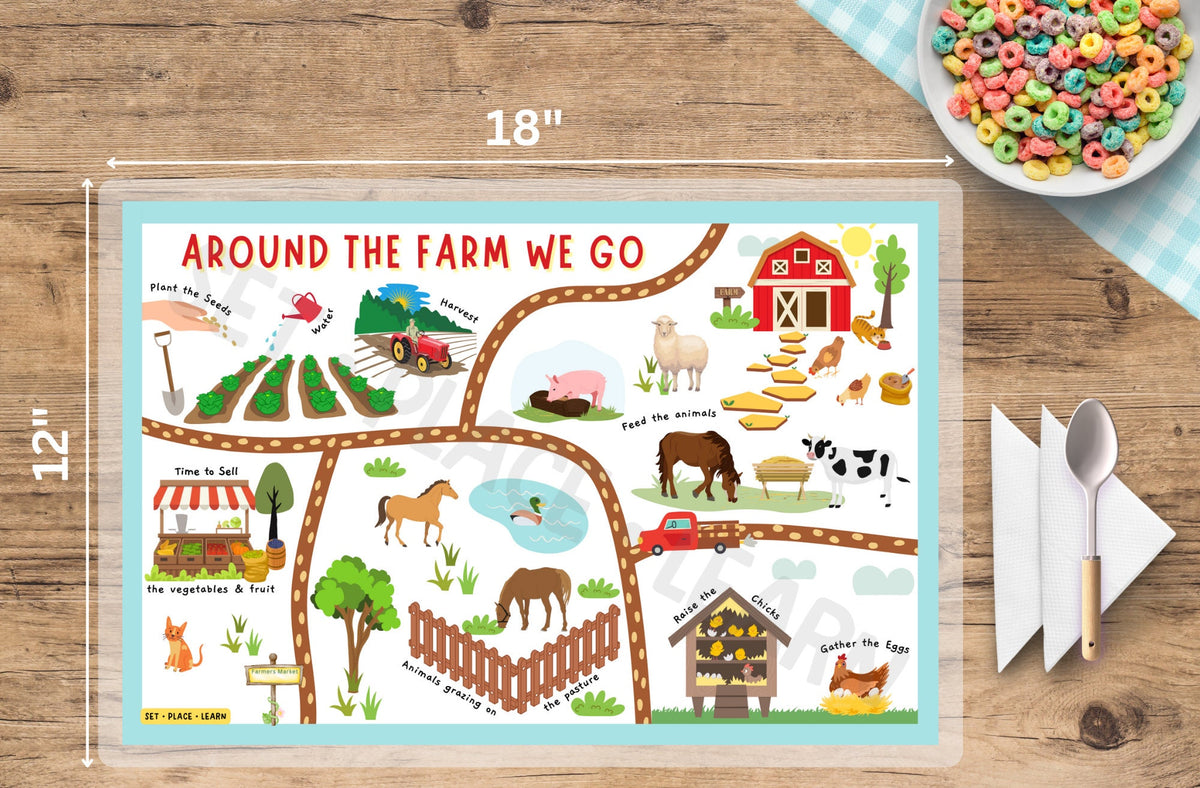 Make mealtimes memorable and educational with our Farm Adventure Alphabet Placemat. Watch your child's face light up with excitement as they discover the wonders of the farm and explore the ABCs in a whole new way. Each letter of the alphabet comes to life with delightful illustrations of farm animals, crops, and equipment. From "A" for Apple Trees to "Z" for Zucchini, every letter is a nod to the day in the life of a farm. Order yours today and bring the charming world of a farm to your child's plate while encouraging early literacy and fostering a love for learning.